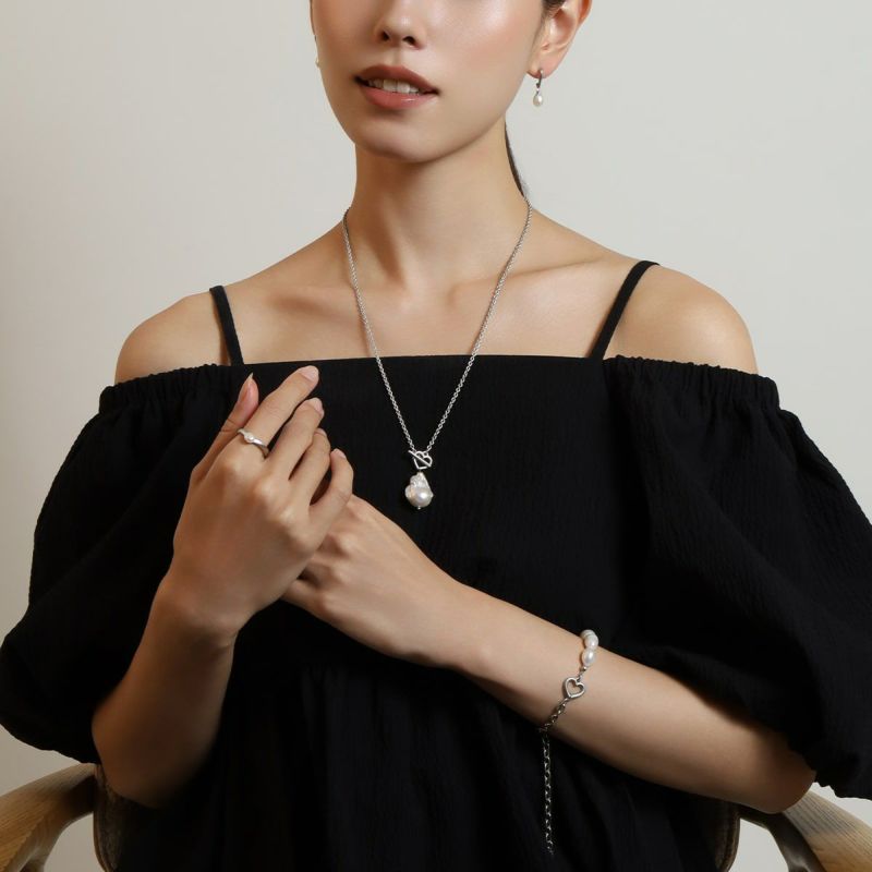 ピアスやイヤークリップと同様に、パールはあえて不揃いなバロックパールを選定。同じ形のない、この世にたったひとつだけあなただけのジュエリーです。