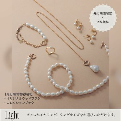 タカシプロデュースブランド「Freecus」から、2nd CollectionのLight(真鍮)のSILVERカラーアイテムを揃えたコンプリートセット。 アクセサリーは、「幸福」などの意味をもつパールが今シーズンのメインに。 上品な印象になりがちなパールアイテムですが、ハートのモチーフを取り入れることで、華やかな場所でもカジュアルに日常使いでも楽しめるようなデザインに仕上げています。 <セット内容>合計5点 ・Secret Heart Pierce or Secret Heart Earrings 1点 ・Heart Pearl Chain Bracelet 1点 ・Pearl Lane Necklace 1点 ・Symbol Pearl Necklace 1点 ・Eternal Side Heart Ring 1点